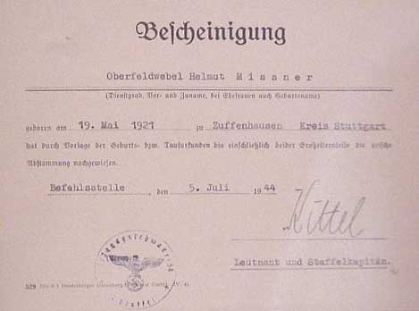 ![]() Im Juli 1942 wird Feldwebel Otto Kittel in Krasnogwardeisk ferngetraut. Vorschriftsmäßig mit Stahlhelm und Dienstanzug erscheint er vor seinem Kommandeur, Hauptmann Philipp, der die Trauung durchführt. Otto Kittel was married in July 1942 by "Ferntrauung" ; a german wartime policy by wich a soldier be married by mailed documents, in Krasnogwardeisk. Hauptmann Phillip celebrates the ceremony. |